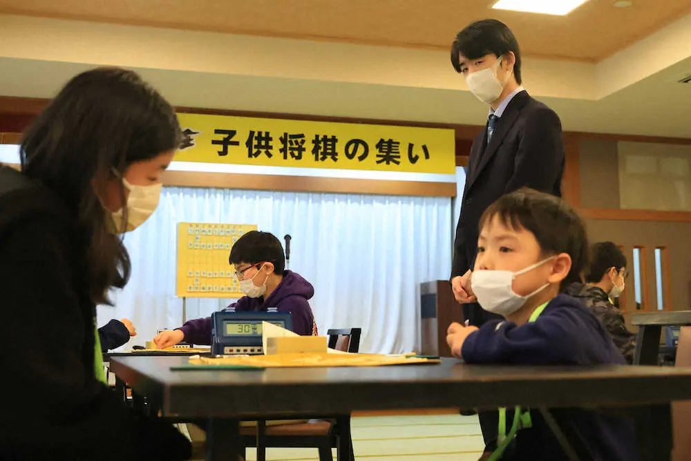 <藤井新王将を囲む会>子供将棋の集いを視察する藤井王将(撮影・西尾 大助)