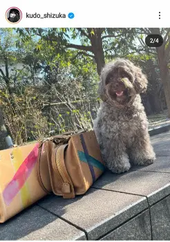 愛犬とバッグ、自身の1ショットなども添えると、「天然由来、野菜や果物の色で染めているので、何だか温かみがあり それでいてヴィンテージ感もあり、使い込んでいく過程がまた楽しめそう お花の裏面の色の出し方も絶妙でとっても気に入ってます」とつづった。