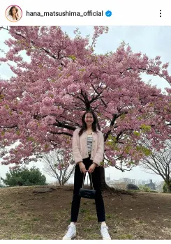 【画像・写真】松島花 桜をバックにレアなへそ出し私服コーデ披露に「めっちゃお洒落」「いつ見ても足が長」の声
