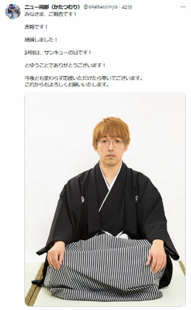 「みなさま、ご報告です!吉報です!」と書き出すと、「結婚しました!3月9日、サンキューの日です!とゆうことでありがとうございます!」と報告。紋付きはかま姿で座る写真とともに「今後とも変わらず応援いただけたら幸いでございます。これからもよろしくお願いいたします」とつづった。
