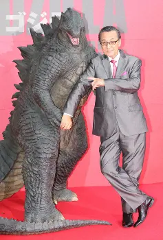 2014年7月、米映画「GODZILLA」プレミアイベントに出席し、ゴジラの模型と記念撮影する宝田明さん