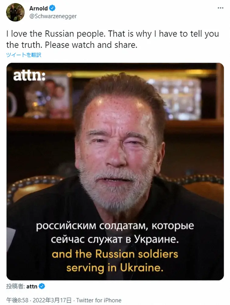 元米カリフォルニア州知事で俳優のアーノルド・シュワルツェネッガー(74)が18日までに自身のツイッターを更新。ロシアによるウクライナ侵攻についてのメッセージを動画で投稿した。