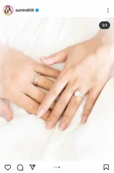 すみれは大きめのダイヤモンドを小さなダイヤモンドで囲んだデザインの指輪をして笑顔の写真を投稿し「結婚発表からずっとこの指輪達も毎日私たちを見守ってくれてます 婚約指輪は、小さい頃から憧れだったクッションカットのヘイロー」と説明。フルオーダーメードの宝石店の「デザイナーさんと一緒に相談して、本当に素敵な指輪が出来上がりました 旦那はダイヤモンドを入れてフルエタニティリングにしました!」とつづり、すみれと、指輪の全周に宝石を入れたフルエタニティリングをした夫の手の写真も投稿した。