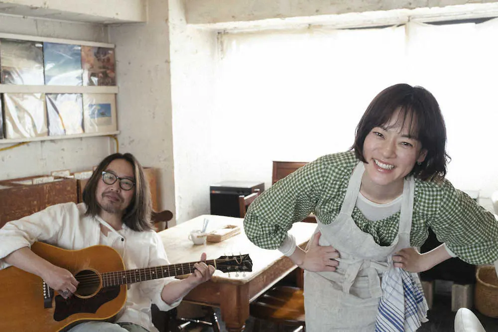 ドラマ「それ忘れてくださいって言いましたけど。」に主演する市川実日子。後ろは共演する曽我部恵一