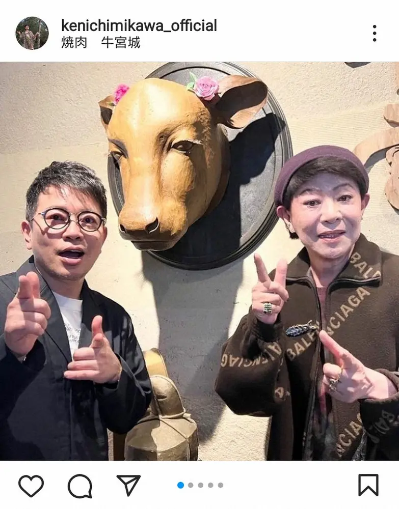 歌手の美川憲一(75)が25日までに自身のインスタグラムを更新。話題の焼き肉店「牛宮城」に行ったことを明かし、オーナーの元お笑いコンビ「雨上がり決死隊」宮迫博之(51)との2ショットを披露した。