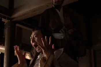 大河ドラマ「鎌倉殿の13人」第12話。館を叩き壊す弁慶(佳久創)に悲鳴を上げる牧宗親(山崎一・左)(C)NHK