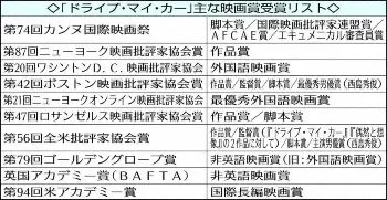 ≪カンヌ皮切りに受賞ラッシュ 上映2館から全米約160館へ≫「ドライブ・マイ・カー」はカンヌ国際映画祭脚本賞など4冠獲得を皮切りに受賞ラッシュ。全米批評家協会賞、ロサンゼルス映画批評家協会賞、ニューヨーク映画批評家協会賞という3大批評家賞を全て制覇。アカデミー賞の前哨戦といわれるゴールデングローブ賞では非英語映画賞を受賞した。米国では昨年11月からニューヨークの映画館2館のみで上映されていたが、今年2月には全米約160館まで規模が拡大した。