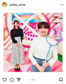 「来週からは入社2年目になる小高茉緒アナ バドガールです」とバドミントンを持つ小高アナとの2ショットをアップ。「キャスターの皆さんからなんとおせんべいを持った私の刺繍入りのハンカチ 大切にします」とも記し、後呂アナの顔の刺しゅうが入ったピンクのハンカチの写真もアップした。