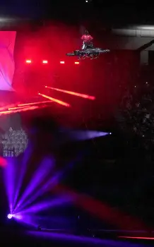 場内に巨大な乗り物に乗った新庄監督に照明が当たり、空を浮遊し始めると、「あ!あ!あ!宙に舞いました!巨大なドローンと言いますか、空飛ぶ車と言いますでしょうか?空飛ぶドローンで、ビッグボス新庄監督が…球ではなく、新庄監督が飛んでいるという、札幌ドーム内、前代未聞の登場となっています!」と続けた。