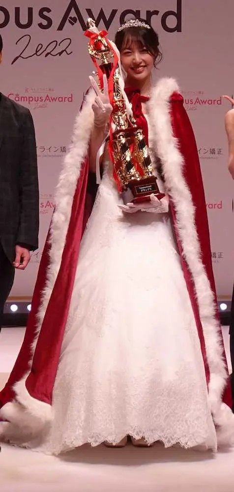 エントリー総数約4000人の頂点に立ち「内気で何も挑戦できなかった私が勇気を振り絞ってミスコンに出て、まさかグランプリまで頂けるとは」と感無量の様子でトロフィーを受け取った。「アナウンサーという夢に向かって走り続けたい」と目標も掲げた。進行役を務めたフリーアナウンサーの岡副麻希(29)から「発声がきれいで聞きやすい」と絶賛された。