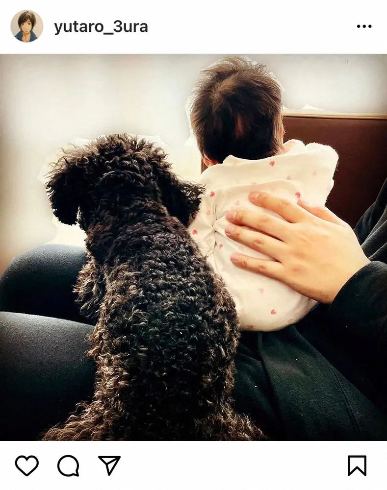 「食後の娘と、寄り添う犬」というコメントとともに1枚の写真をアップした三浦。三浦の膝の上に座る小さなハートが散りばめられたベビー服を着た長女と、愛犬・アリスの後ろ姿を捉えたもので、三浦の手がそっと長女の背中を支えている。
