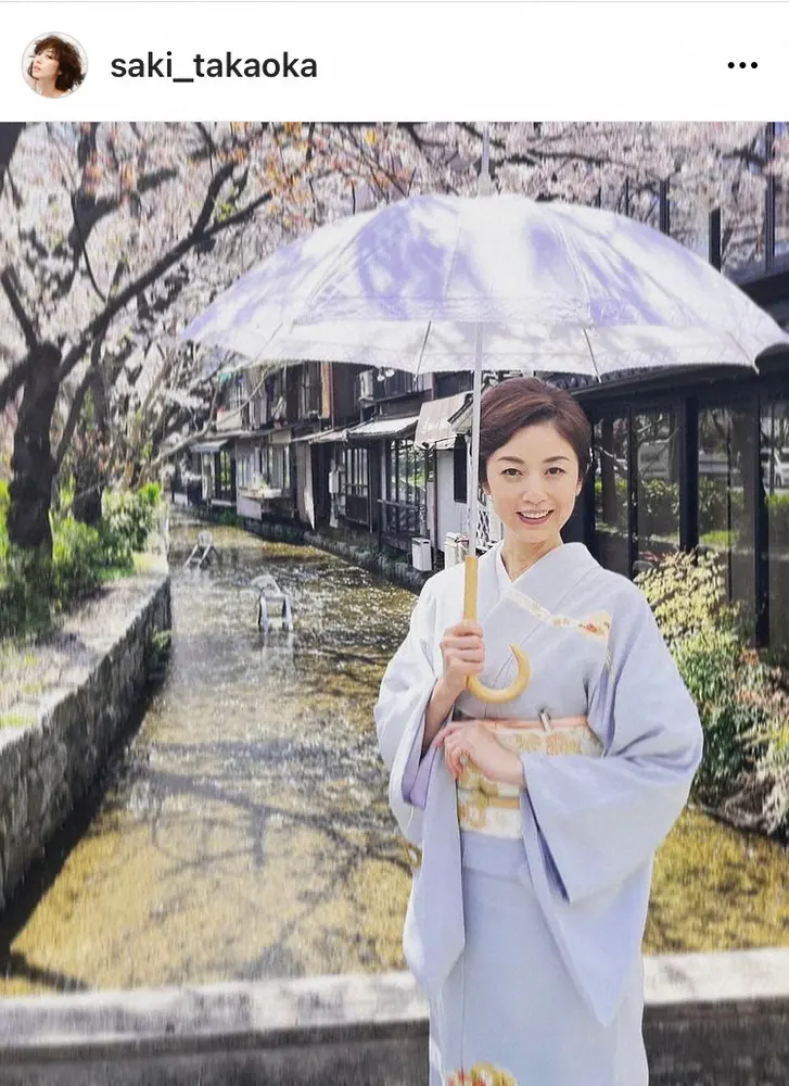 高岡は「京都の桜も綺麗です」という短いコメントとともに1枚の写真を投稿。水色の和服を着て、穏やかにほほ笑む日傘をさすショットで、バックには美しく桜が映えている。