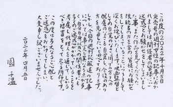 この後には、「しかし、今回の週刊誌報道の記事については事実と異なる点が多く、自分自身以外の関係者にも多くのご迷惑がかかっていることを考慮し、代理人を通じて、しかるべき措置をとって参る所存です」と主張、最後に「この度は多大なるご心配とご迷惑をおかけしてしまい、大変申し訳ございませんでした。二〇二二年四月五日 園子温」と締めっくくった。