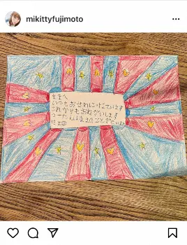 藤本はこの日、「仕事から帰ってきたら娘からこんなメッセージが」と1枚の写真を投稿。赤と青の地に星やハートが描かれた国旗のような絵の中央には「ままへ」という書き出しのメッセージが書かれているもの。