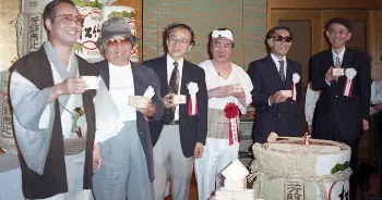 1995年、赤塚不二夫さん(左から4人目)の還暦パーティーに出席した(左から)つのだじろうさん、石ノ森章太郎さん、鈴木伸一さん(1人おいて)藤子不二雄Aさん、藤子・F・不二雄さん