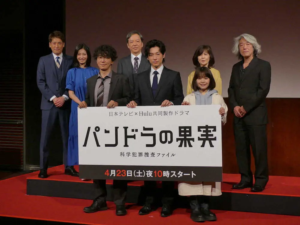 日本テレビドラマ「パンドラの果実 科学犯罪捜査ファイル」の記者会見に出席した(前列左から)ユースケ・サンタマリア、ディーン・フジオカ、岸井ゆきの、(後列左から)佐藤隆太、本仮屋ユイカ、板尾創路、石野真子、羽住英一郎監督