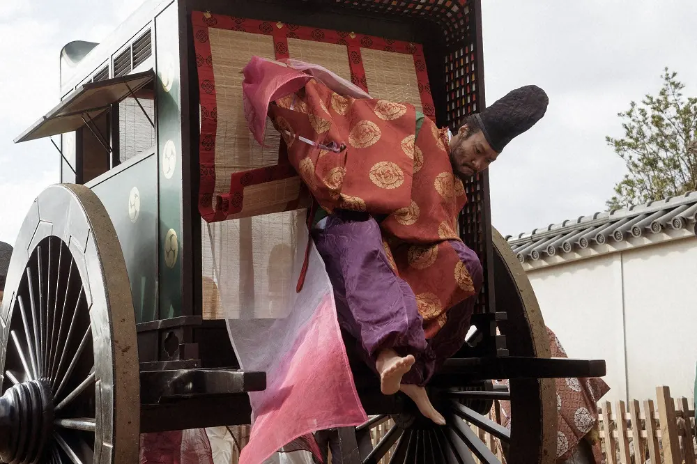 大河ドラマ「鎌倉殿の13人」第14話。牛車から飛び降りる木曽義仲(青木崇高)(C)NHK