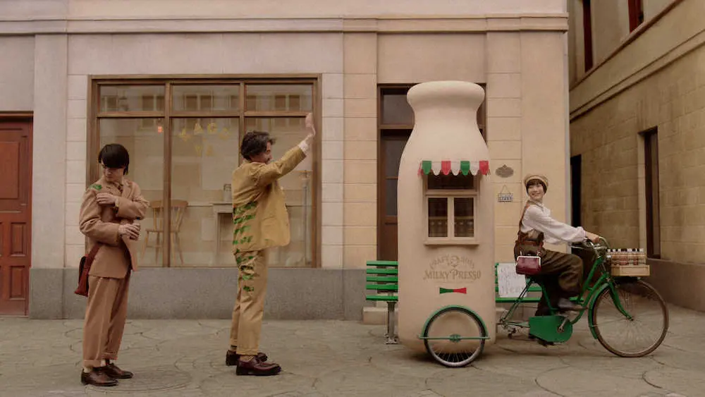 ある朝、杉咲が「おはようございます!」と牛乳瓶型の店舗を後ろに積んだ自転車でやって来る。常連客の役所がオーダーすると「はい」と手渡し、隣の神木に「あなたも」と差し出す。ひと口飲んだ神木は「コーヒーニューニュー!」とつぶやくという内容。