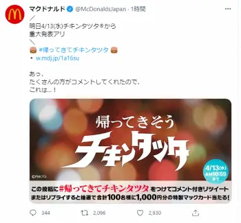 日本マクドナルド“粋な演出”にネット大興奮!「帰ってきてチキンタツタ」が世界トレンド1位獲得