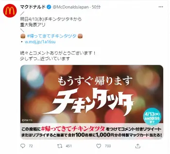 日本マクドナルドが12日、公式ツイッターを更新。あす4月13日に重大発表あるとし「復活にむけて、協力者求む!“#帰ってきてチキンタツタ”をつけてみんなの想いをコメントしてください」と呼びかけた。