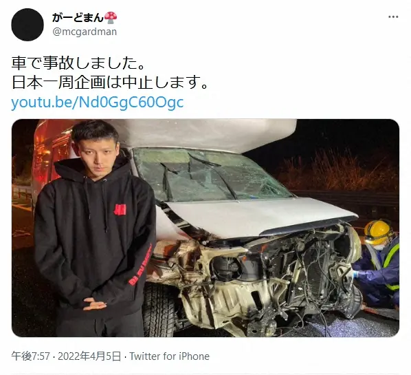 そんなグループが挑戦していたのが「キャンピングカーで日本一周企画」。視聴者らにも期待するよう呼びかけていたが、ある“大事故”が発生したという。5日に投稿された動画でがーどまんは「コラ画像とかじゃなくて事実です。キャンピングカーが横転しました」とまさかの報告。当時はスタッフ2人が運転中だったというが、周囲をふくめてけが人は1人も出ていないという。事故の原因は不明だというが「楽しみにしていたみなさん、マジすみませんでした」と、企画の中断を謝罪していた。