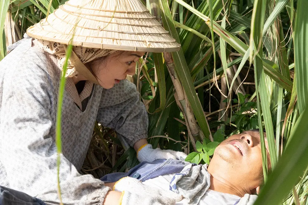 連続テレビ小説「ちむどんどん」第5話。サトウキビ畑で突然倒れる賢三(大森南朋)に駆け寄る優子(仲間由紀恵)(C)NHK