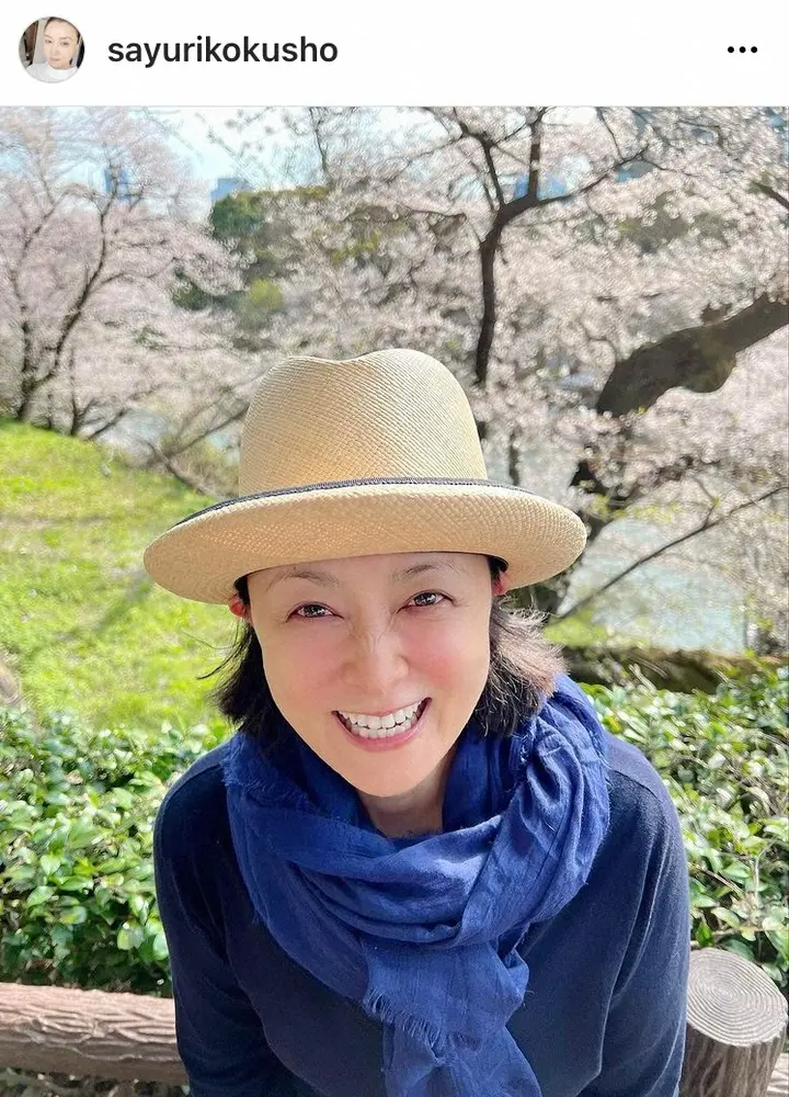 「葉桜になった今日この頃、遅まきながら、お花見の写真です」と満開の桜をバックにした自身の写真をアップ。紺色のトップスに青のストール、麦わら帽子というスタイルで満面の笑顔を浮かべるショットになっており、「桜に染まった素肌、今日も絶好調です」とつづった。