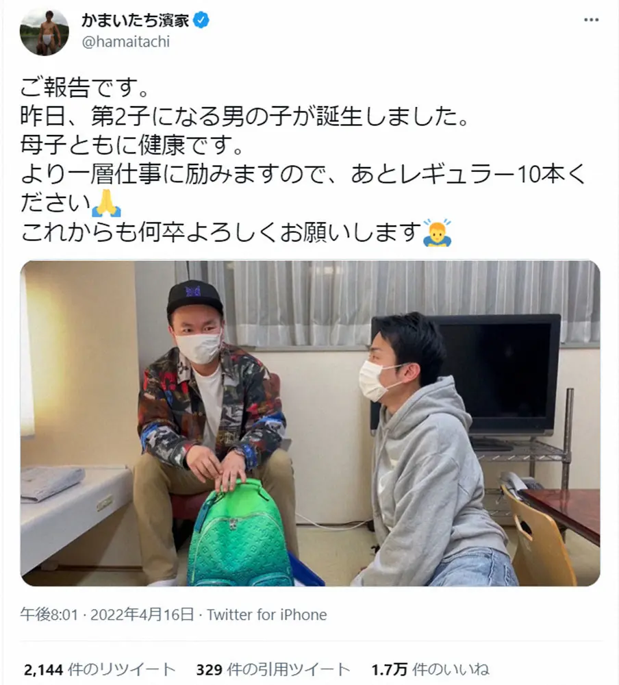 かまいたち濱家 第2子誕生を報告「あとレギュラー10本ください」 ファンから祝福の声相次ぐ