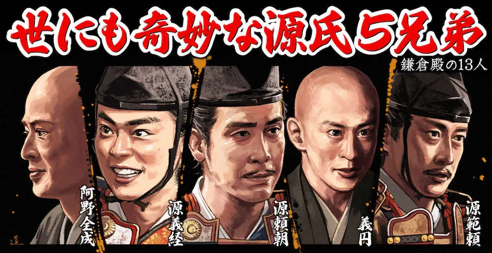 イラストレーターの石井道子氏が描いたNHK大河ドラマ「鎌倉殿の13人」第10話“大河絵(鎌倉絵、殿絵)”「世にも奇妙な源氏5兄弟」
