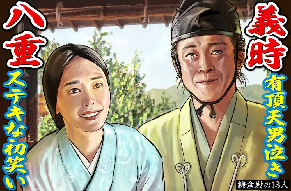 イラストレーターの石井道子氏が描いたNHK大河ドラマ「鎌倉殿の13人」第13話“大河絵”(鎌倉絵・殿絵)「義時 有頂天男泣き」「八重 ステキな初笑い」