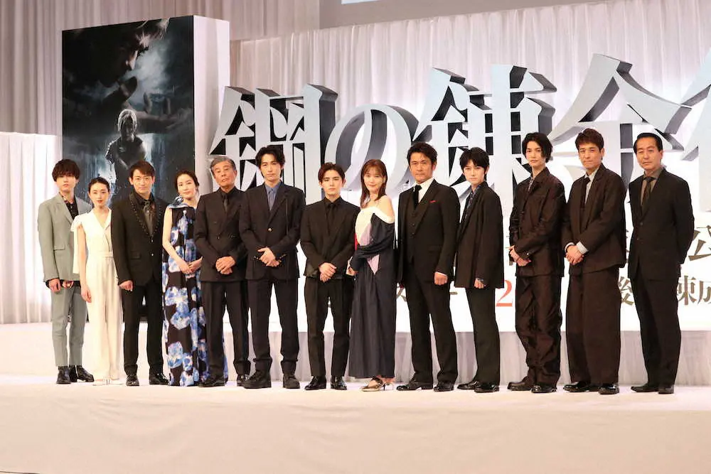 映画「鋼の錬金術師 完結編 復讐者スカー/最後の錬成」の制作報告イベントに出席した(左から)水石亜飛夢、栗山千明、山本耕史、蓮仏美沙子、舘ひろし、ディーン・フジオカ、山田涼介、本田翼、内野聖陽、本郷奏多、渡邊圭祐、佐藤隆太、曽利文彦監督(撮影・糸賀日向子)