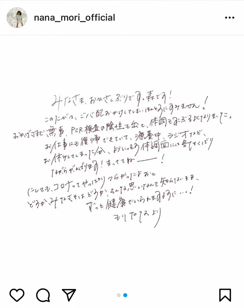 森七菜スタッフ公式インスタグラム(@nana_mori_official)より 森七菜 新型コロナ感染から復帰を報告「体調面にも気をくばりながら、が… ギャラリーで見る この記事のフォト 2022年04月25日の画像一覧 もっと見る 2022年04月25日の画像をもっと見る
