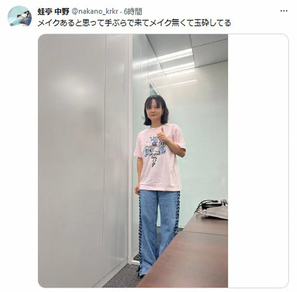 「メイクあると思って手ぶらで来てメイク無くて玉砕してる」と記すと、すっぴんでピンクのキャラクターTシャツにジーンズ姿のイワクラのショットをアップした。