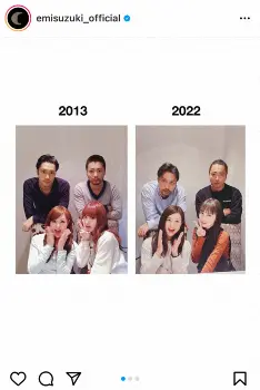 鈴木は「2013年の私たちと、今年の私たち」と2002年に放送されたフジテレビ「ロング・ラブレター~漂流教室~」で共演もしている山田、内田、望月との9年前と同じポーズをした現在の4ショットを並べた写真などを投稿。写真の違いに「私たちも、カメラも進化しています」と時の流れを感じていた。ハッシュタグには「#手がブレない」「#漂流教室ロングラブレター」と添えた。