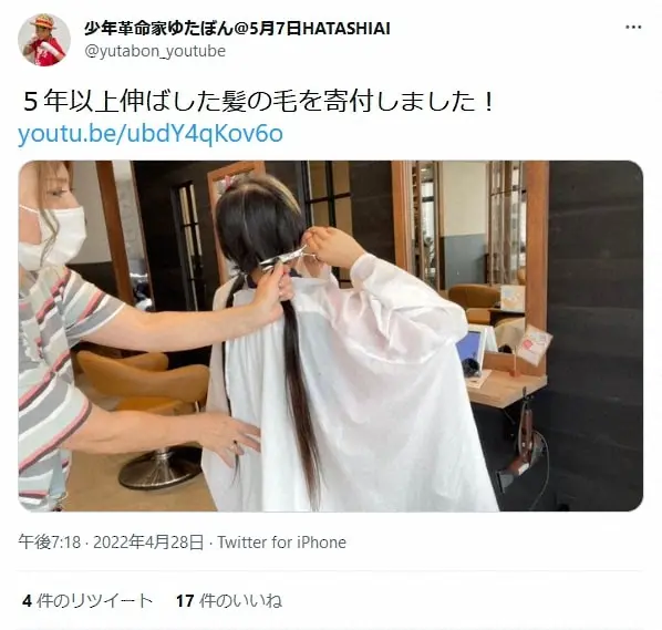 「少年革命家」を名乗る不登校ユーチューバーのゆたぼん(13)が28日に公式YouTubeチャンネルを更新し、5年間伸ばした長髪を寄付する場面を投稿した。