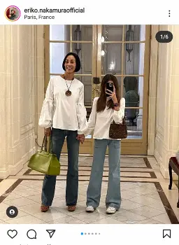 中村は「先週末から次女と2人っきりのパリ」とし「毎日ではなかったけれども、私は作り慣れないお弁当作りや送迎。2人っきり最終日、食事に出かけました!」と次女とのツーショット写真を投稿。「2人でお揃いにしてみたのですが分かりますか?次女のジーンズと同じ形なので、15年間しまいこんでいたリーバイスをひっぱり出した!!」と説明。白のトップスにフレアジーンズ姿を披露した。