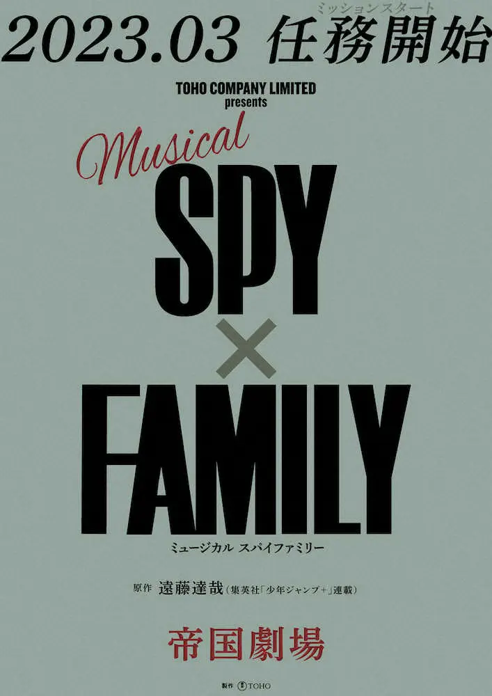 「週刊少年ジャンプ+」(集英社)に連載中の人気漫画「SPY×FAMILY」がミュージカル化され、来年3月に東京・帝国劇場で上演されることが30日、発表された。原作は遠藤達哉氏(41)で、19年3月に連載がスタート。敏腕スパイが、超能力者の少女と殺し屋の女性と仮の家族となるアクション・コメディー。「このマンガがすごい!2020」オトコ編1位など高い評価を得て、単行本は累計1500万部を超えている。4月からはテレビ東京でアニメが放送されている。キャストは今後発表。超能力者の少女役は大規模なオーディションで決定する。