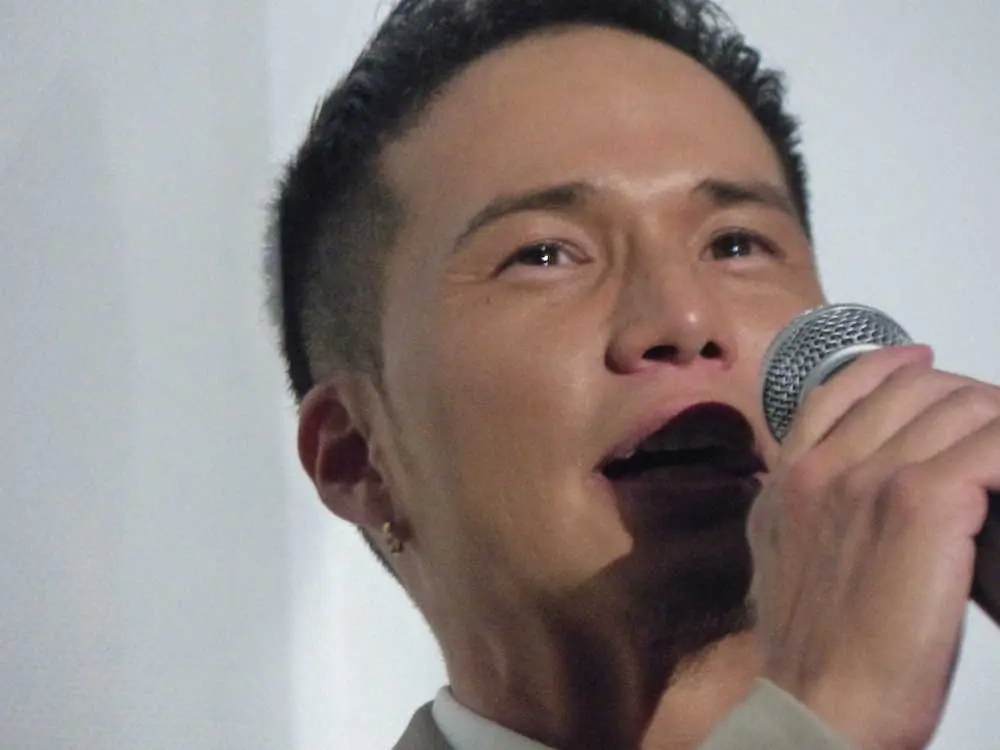涙を浮かべ舞台あいさつする市原隼人