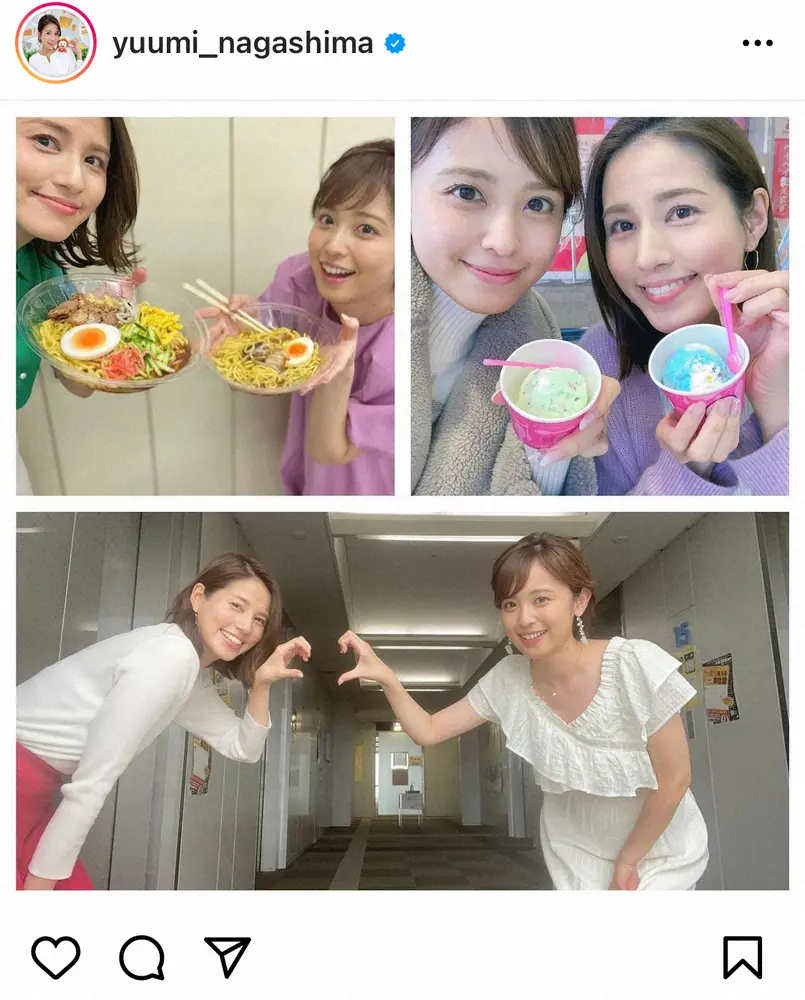 「思い出がたくさん。昔の写真をさかのぼったら、だいたい一緒になにかを食べていました笑。久慈ちゃんこれからも変わらずよろしくね」とつづり、久慈アナとの過去の思い出ショットを添えた。