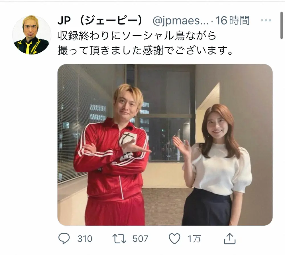 番組放送後、自身のツイッターを更新したJPは「収録終わりにソーシャル鳥ながら撮って頂きました感謝でございます」(原文ママ)とつづり、郡司アナと優しくほほ笑む2ショットをアップした。