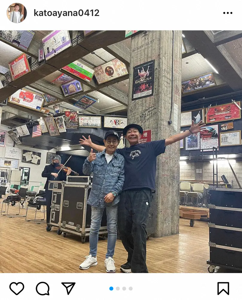 「加藤茶&木梨憲武さん 木梨憲武 交響楽団 THE CURTAIN CALL SHOWにシークレットゲストでカトちゃんが出演してきました。この間、木梨憲武さんと食事してるときに話していた事が実現し。。。笑 東京フィルハーモニー交響楽団の皆様の演奏で。。。」と2日に行われた「木梨憲武 交響楽団 THE CURTAIN CALL SHOW」でのオフショットとして、茶と木梨の豪華な2ショットを披露した。