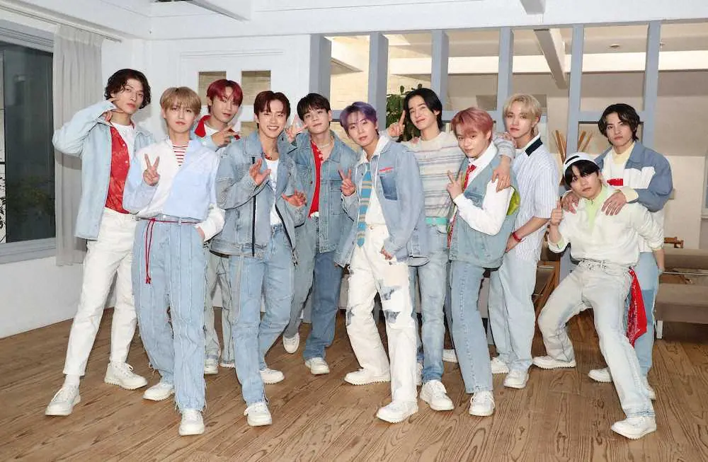<「JO1」イベント>フォトセッションでポーズをとる(前列左から)白岩瑠姫、河野純喜、川尻蓮、鶴房汐恩、木全翔也(後列左から)金城碧海、與那城奨、豆原一成、佐藤景瑚、大平祥生、川西拓実(撮影・村上 大輔)
