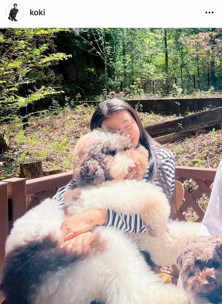 Koki,は、「ここ数日の写真」と、愛犬「エトくん」との2ショットや真っ青な空の写真を公開。続けて「ここさんに癒されて居ます」と姉・Cocomiのリラックスした表情の写真を公開した。