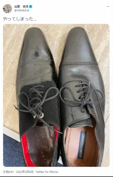 「1個、怖いことがあって」と切り出した山里。ゴールデンウィーク中だった6日、なんばグランド花月での出番があり、早朝から1日4ステージの準備をして新幹線で向かったといい「暗い中で準備して。スーツをまず揃える。そして、舞台用の靴をとって、ビニール袋に突っこんで、リュックに入れて。で、朝7時前ぐらいの新幹線に乗って。で、行くわけですよ、大阪に。で、NGK着きまして、リュックの中から靴を出したら、驚いたんですよ。形は全く一緒なんだけど、左右、素材が全然違う靴を持ってきたの。革とエナメル」と思わぬミスを犯してしまったことを告白。そのハプニングが起き、さっそく写真を撮り、「やってしまった…」とツイッターで投稿した山里。これですぐさま東野が反応し、「山里さん。わざとでしょ」とツッコミを入れた。