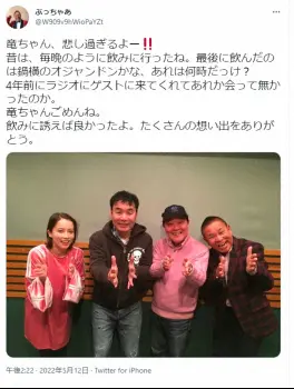 ぶっちゃあは「竜ちゃん、悲し過ぎるよー」と悲痛なツイート。「昔は、毎晩のように飲みに行ったね。最後に飲んだのは鍋横のオジャンドンかな、あれは何時だっけ?」と呼びかけた。