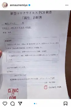 「皆様へ 本日はご報告があります。昨日夕方体調不良の為、クリニックにてPCR検査を致しました。結果は15分で出ました。結果は、陽性」と診断書の写真とともに新型コロナに感染したことを発表した。