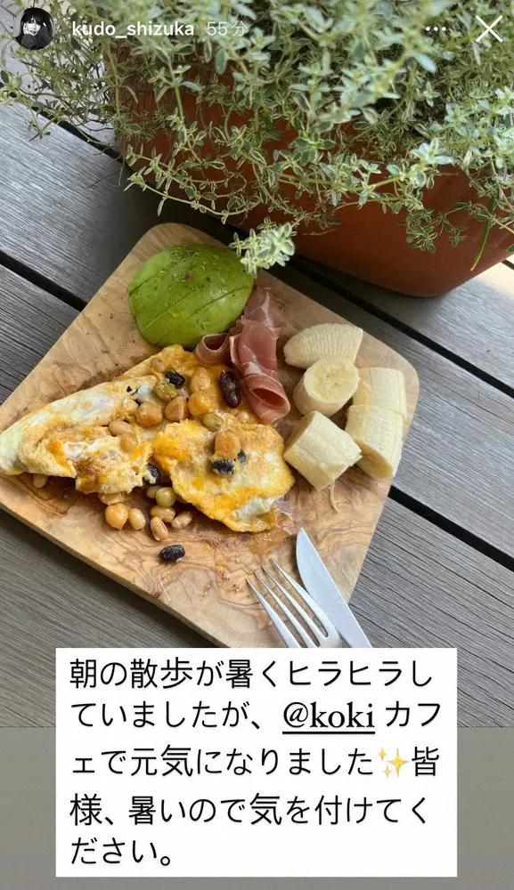 工藤は「朝の散歩が暑くヒラヒラしていましたが、Kokiカフェで元気になりました」と、娘手作りのおしゃれなモーニングプレートを公開。「皆様、暑いので気を付けてください」と呼びかけた。