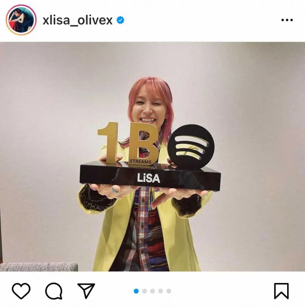 歌手のLiSA(34)が18日、自身のインスタグラムを更新し、楽曲の配信サイト「Spotify」での総再生回数が10億回を突破したことを報告した。
