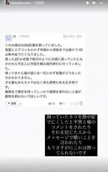 ストーリーズでは、22日に保護猫の譲渡会に行ったことをブログにつづったが「すごい言われようなんだけどね…さすがに許せないや」と怒りをあらわに。書き込まれたコメントには「この夫婦は以前3匹猫を飼っていました。真夏にエアコンもかけず早朝から深夜まで出かけて1匹は熱中症で亡くなりました」などと書かれており、「平然と嘘のコメントをされたり それを信じた人からメッセージで酷いことを言われたり もうさすがにこれは黙ってられないです」ときっぱり否定した。