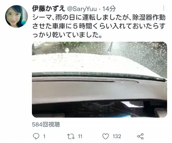 28日には「シーマ、雨の日に運転しましたが、除湿器作動させた車庫に5時間くらい入れておいたらすっかり乾いていました」とつづった。